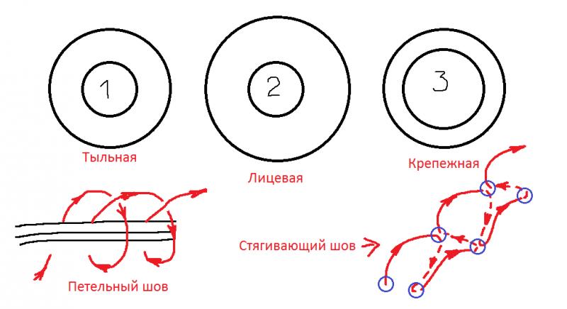 6. После того, как половинки окончательно сшиты, расправляем поролон, разминая амбушюр, и далее приступаем к работе над крепежной деталью. Перед тем, как ее пришить, нужно сделать на ней стягивающий шов, который предотвращает отставание этого кружка от поверхности рамки в натянутом виде. Есть разнообразные подходящие швы. Это на словах трудно объяснить - нужно показывать. В принципе, можно этого и не делать. Пришиваем данную деталь к амбушюру, стараясь попадать в тот же шов, которым он сшит по внешнему диаметру. Я повторно прошиваю петельным швом. Опять же, следим, чтобы деталь пришивалась равномерно и не съехала. Можно так же нанести метки.
