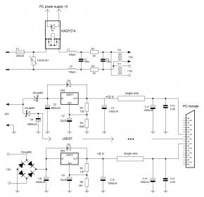 Как оказалось, карточка питается от напряжения +5 вольт и +- 12 вольт. Использовал трансформаторы, имеющиеся под рукой, без средней точки, поэтому на каналах +-12 вольт применены однополупериодные выпрямители на диодах Шоттки. Мощность каждого трансформаторов примерно по 15 Ватт.