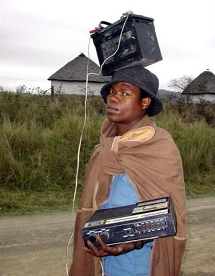 Дело происходит где-то в Африке. С батарейками, очевидно, там туго, и местный паренек догадался к магнитоле подсоединить автомобильный аккумулятор. Народ там привычный носить тяжести на голове: