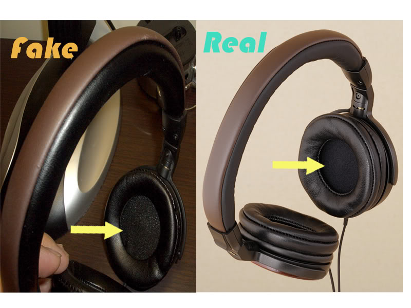 На фото ниже видна разница в зажиме дужки, которого нет у фальшивых наушников, креплениях чаш к дужке и цвет надписи Right.