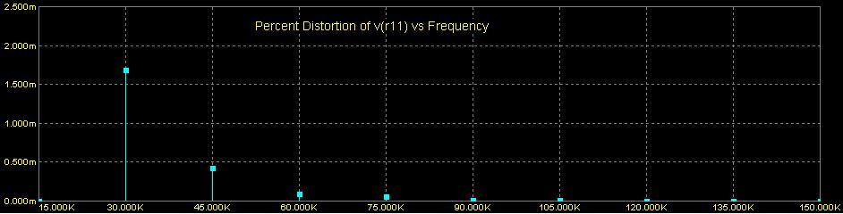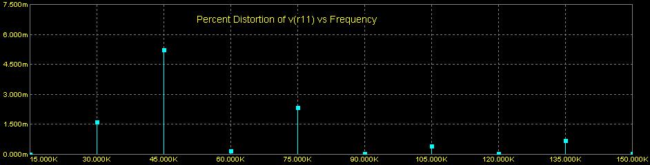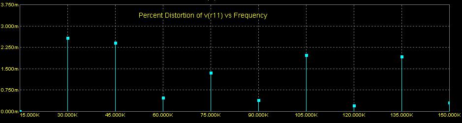 Для примера приведу спектры искажений одного и того же усилителя, работающего в разных классах. Входной сигнал - синус 15кГц, по оси Y величина искажений в тысячных долях %, по оси X частоты гармоник.