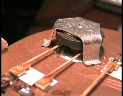 Далее, фиксирую стальной шарик на магнитике и кладу на его выпуклость выпуклостью вниз излучатель. Конусно заточенным концом спички выворачиваю излучатель по описанию в статье. Получаем "диффузор"!