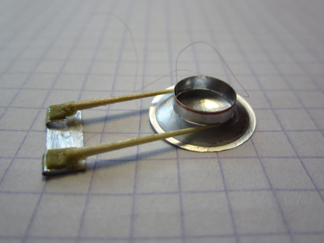 Звуковая катушка - 10 витков провода ПЭВ-0,04 примерно. Провод достаю из китайского динамика MRI 20N-A (диаметр 2 см, моща 0,25 Вт, импеданс 150 Ом)