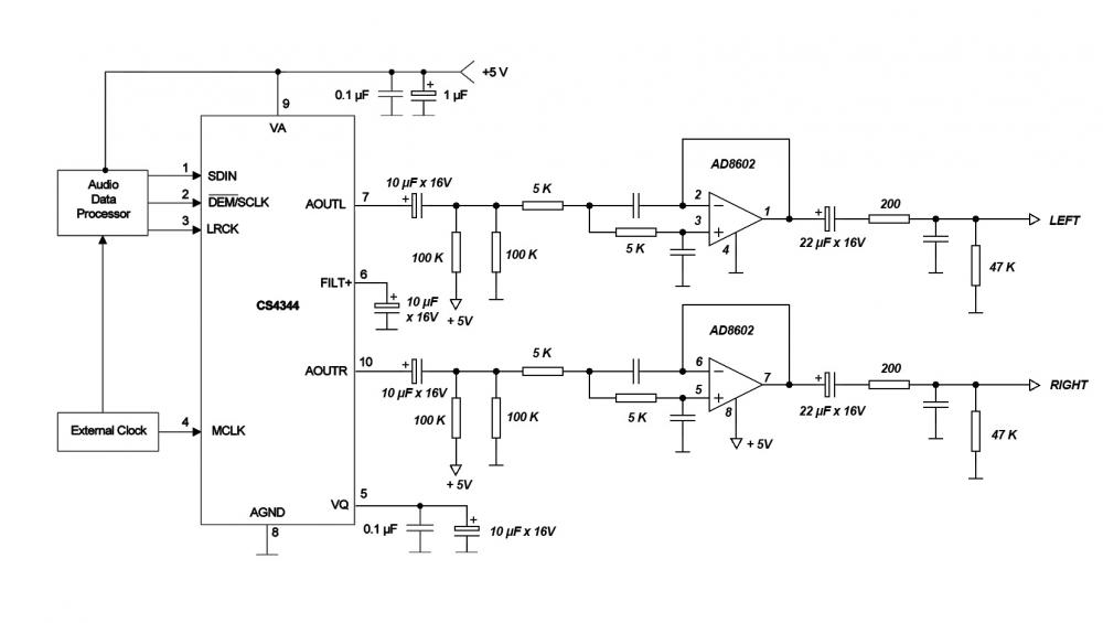 Итак, я его открыл, срисовал схему аналогового выхлопа, вместе с ЦАПом, который, как я понимаю подключен по I2S. Все что между USB и ЦАПом залито черным компаундом с двух сторон платы, процессор не опознать. ЦАП - CS4344 от Cirrus Logic, после которого идет операционный усилитель AD8602D. Клок скрывается под радиатором стабилизатора питания, сам блоки питания внешний и слава Богу не импульсный, имеет 6В и 2А.