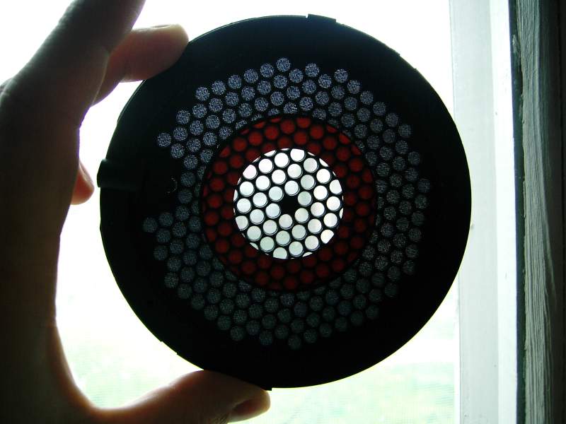 Как мы знаем, излучатель этот электретный. Т.е. в отличии от электростата он не требует подавать на мембрану напряжение поляризации, т.к. мембрана и без него, стараниями производителя, поляризована. Помимо того что он электретный, у него есть ещё одна особенность (если не сказать странность) -он имеет две (!) мембраны. По одной с каждой стороны излучателя. Статор соответственно один (сделан из очень тонкой плетёной металлической сетки), заключен по середине между мембранами. Такое решение имеет как достоинства, так и недостатки. К достоинствам можно отнести повышенную в отличии от одномембранной схемы чувствительность, а к недостаткам то, что между мембранами заключен некий объём воздуха, который имеет свою, определенную этим объёмом, резонансную частоту.