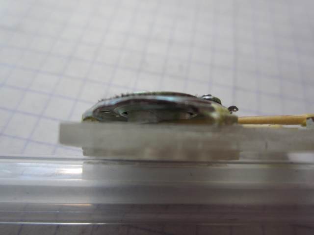 Вырезаю из то же фольги круг диаметром около 13,6 мм и накатываю его стальным шариком от подшипника. Диаметр шарика примерно равен диаметру круга. Получаем сферический сегмент. Его по периметру приклеиваю "лак -цапоном" к кольцу из фольги.