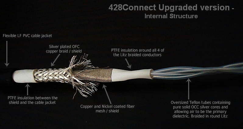 428 connect - имеет двойное экранирование, OCC серебряные монокристаллические проводники. Несмотря на умеренную цену кабель четкий, подробный и просторный и поддерживает значительный объем и в отличие от многих кабелей из чистого серебра. Этот кабель имеет низкую емкость использует наилучшее сочетание диэлектриков, проводящих материалов и геометрию для того, чтобы достичь того, что многие, гораздо более дорогие кабели не в состоянии передать.