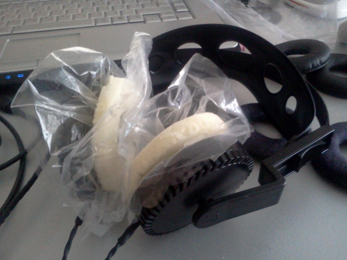 Вобщем амбушюры сделаны из плотного поролона в виде бублика (стояли на гарнитуре Sven CD-830, обтянутые дермантином, в живом виде звучали ужасно), обернутого целофаном. Пока все сделано очень вульгарно, но видимо придется покупать пару черных пакетиков и делать что-то поприличнее, потому что звук очень нравится.