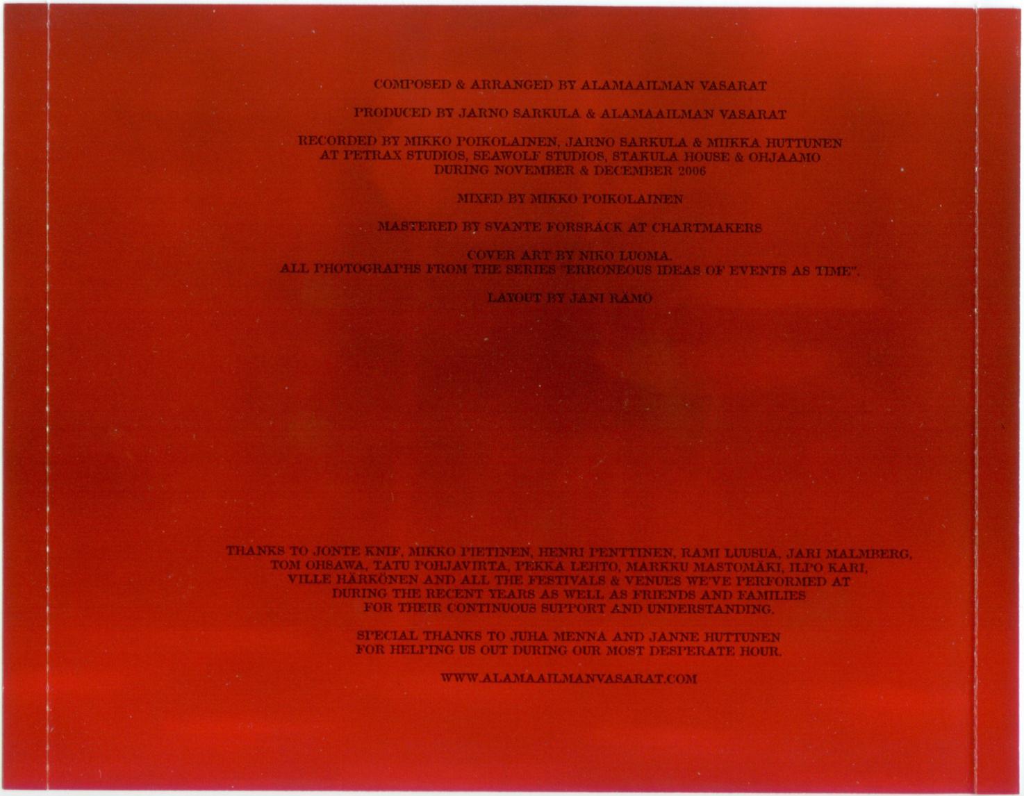 Alamaailman Vasarat - "Владыки подземного царства" - культовая инструментально-акустическая финская Avant-Garde группа. Была образована в 1997 году двумя членами avant-garde progressive rock band Hoyry-kone: Teemu Hanninen (drums) и Jarno Sarkula (flute, soprano sax, bass). В 1998 к ним присоеденяются другие члены Hoyry-Kone Marko Manninen(cello), Miikka Huttunen (pump organ), и Erno Haukkala (trombon).