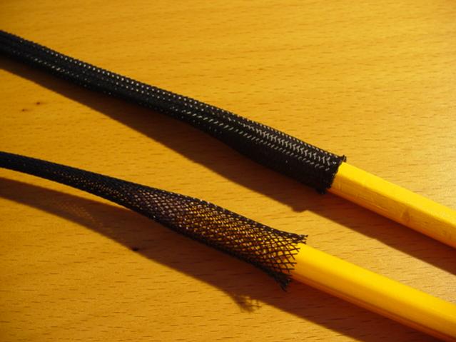 Новая оплетка иногда перед одеванием кабеля нужно расправить. Проще это сделать, просунув что-нибудь типа карандаша по всей длине оплетки.
