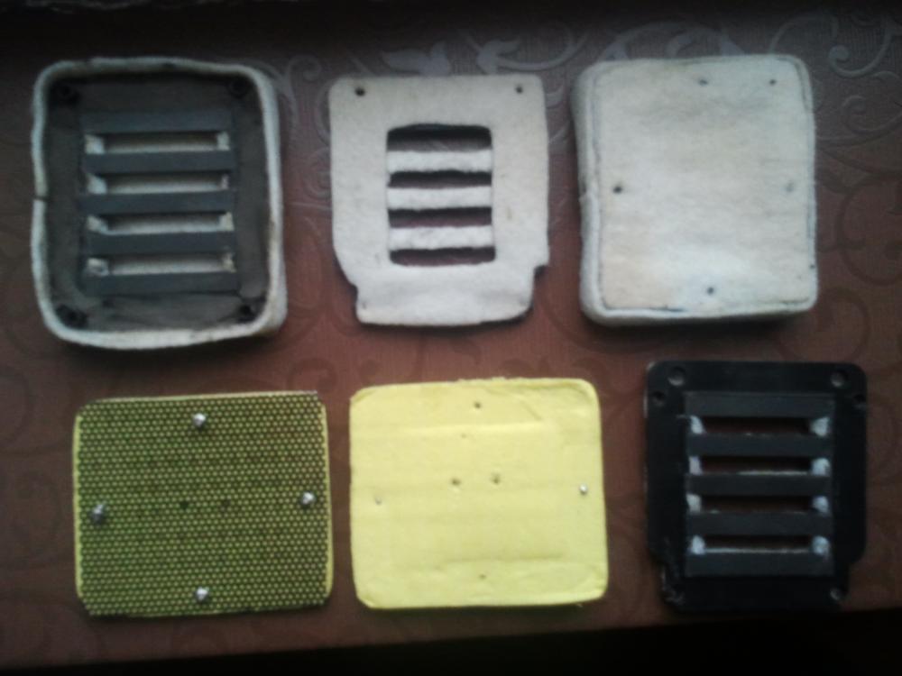 Сзади поставил решетку, вырезанную из автомобильной колонки Ямаха. Дополнительный демпфер сделал из желтой хозяйственной губки.В ней сделаны два отверстия приблизительно по 3 мм напротив центральных щелей магнитов. Демпфирование производилось на слух , после установки амбушюров. Естественно можно сделать любое. Стыки между фм промазаны сп. Третие концы косичек проводов закреплены саморезами. Решетки то же закреплены саморезами.