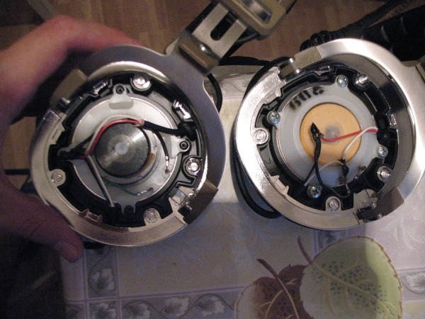 Доброго времени суток. Недавно решил разобрать Koss Pro 4\AAA. Поскольку наушники были после реставрации (такими уже купил отсылал на реставрацию не я) интересно было посмотреть что же там было отреставрировано, новые амбушюры было видно сразу, а вот что же в середине? Пластмассовые крышки на защелках, стоит только аккуратненько поддеть ножом и готово. Ставятся они на место тоже легко и удобно. На одной из чаш по всей видимости меняли динамик или чинили его, так как крепления динамика залиты пластиком, а этот был привинчен на болтах. И конечно же нужно было мне посмотреть как он устроен))) один провод идущий от катушки динамика к контакту я успешно и оборвал. После хирургической работы (нужно было не оборвать второй и не испортить мембрану, а провод очень тоненький) провод я припаял, но пайка не получалась сразу, провод покрыт лаком (неплохо покрыт так) и его трудно было залудить. Во время этого процесса я его многократно перегибал. Поэтому наушники отыграли еще около четырех часов и провод оборвался уже в упор под катушкой, это финал. Но расставаться с наушниками не хотелось, слушаю много отечественного рока и мне нравится как они играют, тем более начал собирать ламповый усилитель т.к. уже неоднократно писалось, на операционниках (а у меня на них Corda Arietta) эти наушники резко звучитат, и я полностью с этим согласен. Пытался купить здесь, тема даже есть в соответствующем разделе, но тщетно, посоветовали обратится в сервисный центр(здесь в Харькове), но я решил купить еще одни на Ибей тем более что подвернулся хороший вариант. Вторые наушники приехали, я первым делом решил поменять амбушюры, на тех что приехали в хорошем состоянии но не новые. Процесс замены легкий и безболезненный они приклеены "не засыхающим" клеем. И потом заглянул под крышку тем более это нетрудно и неопасно для наушников, сам динамики я уже без особой надобности разбирать не буду тем более что крепления этих залиты пластмассой. И обнаружил динамики другой конструкции, по диаметру одинаковы, импеданс тоже одинаков (250 Ом) сам замерял, а вот конструкция немного другая. Вместо пластмассового "болтика" который можно крутить прижимая или отпуская демпфирующий матерьял (похож на губку) и менять демпфирование, большая шайба для тех де целей, с одного бока залита клеем видимо чтобы сама не развинчивалась. И с верху шайба удерживается железной довольно толстой пластиной. Также сам корпус динамика имеет отличая в одной из версий он более толстый,массивный. Звучат наушники отлично в своем стиле. Фото прилагаются. Интересно зачем это Koss делал разные динамики ведь это же техпроцесс перестраивать нужно.