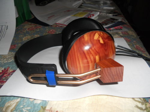 This is for a brand new set of Cedar-Pants, which is what I call them. They are almost exactly like the Thunderpants created by "Smeggy" on Head-Fi.org. They look and sound very very nice. I dampened the back of the cup with a thin piece of craft felt and I dampen the audio drivers with some clay. I also put in one jumbo sized cotton ball torn apart. This helps bring out more details. I put a single 1/8" bass port hole and a single 3/16" bass port hole to allow for awesome bass. If you want less bass, for say a classical song, I will supply 2 plugs for each 3/16" bass port hole so it can tune down the bass and make the headphone more balanced. I use 22 Awg Silver Teflon wire that will be covered in black techflex. The one in the picture shows nylon, but I am using techflex instead on the model I will ship to you. The headphone cups on the one I am selling are also a little bit more round than the ones in the pictures. I am using a white belt for a headband suspension mod as you can see in the pictures. These headphones have amazing bass and a stunning mid frequency response. It will come with a 3.5mm end plug. The wood is fresh cut cedar and I can stain it either Tudor Gloss, Pecan Gloss, or Natural Cherry Satin. It is your choice. The one in the picture is Tudor Gloss.