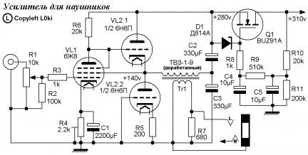 Схема раз. Просто катодный повторитель Уайта без предварительного каскада. Усиление по напряжению для моих наушников не требуется, что как раз и обеспечивает вышеназванный повторитель, плюс к этому минимальное выходное сопротивление. 6Н6П хорошо вписывается в требования минимального внутреннего сопротивления и низкого анодного напряжения http://www.magictubes.ru/sprav/pdf/6n6p.pdf .
