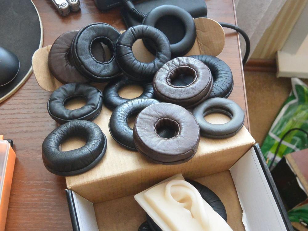 В итоге оставлены из очень мягкой кожи, внутри очень мягкий поролон, пошиты в 4 шва с бортиком, внешний диаметр 65, внутренний 28, высота амбушюр 16-17.