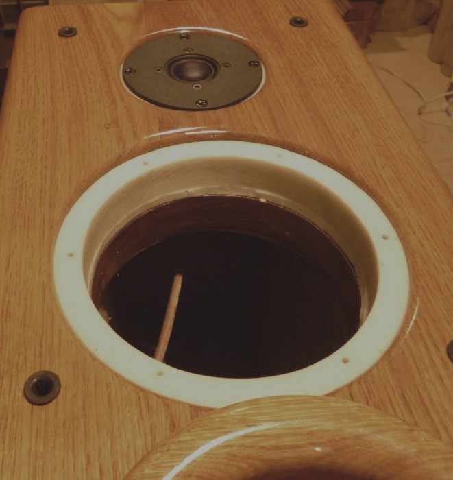 - экспоненциальный кольцевой фазоинвертор (диаметром 110 мм и частотой настройки 40 Гц) без стояков и свистов с «дульным тормозом» уникальной авторской конструкции.