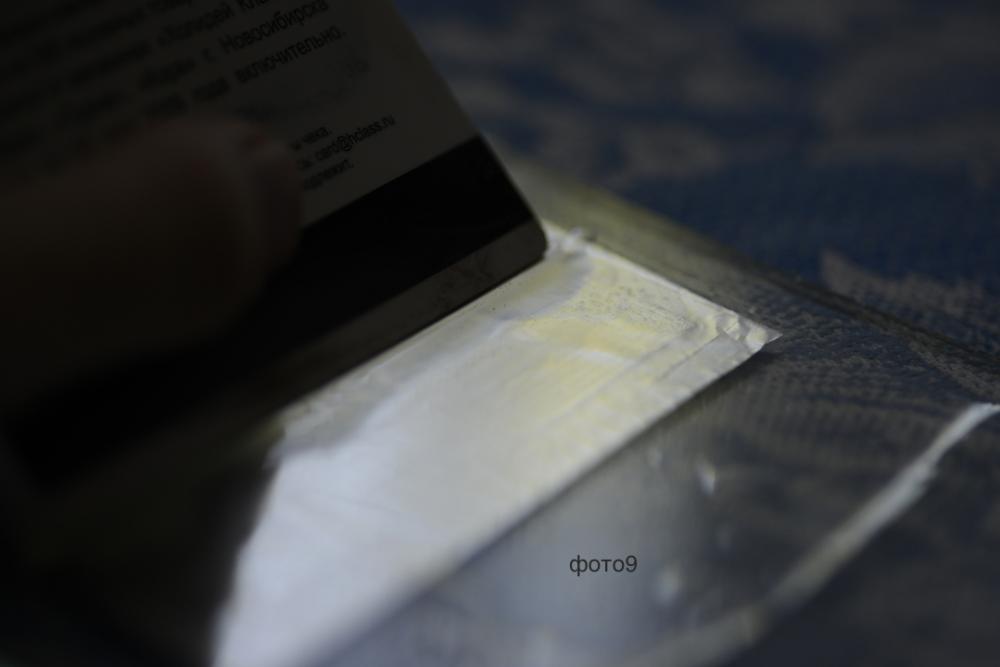 Теперь очищаю предметное стекло, капля воды, сверху фольга, дорожками вниз, зачищаю «клеевую сторону» фольги изопропиловым спиртом ватной палочкой(фото7). Наношу дорожку клея по центру(фото8), сверху лавсан и разглаживаю кредиткой клей под лавсаном(фото9), чтобы не было пузырей(до талого вышаркивать клей не надо). Когда клей равномерно нанесен, разделяю лавсан и фольгу осторожно(фото10), немного дую на нанесенный клей (он полимеризуется), затем снова соединяю лавсан и фольгу, ВСЕ намертво приклеен(фото11).