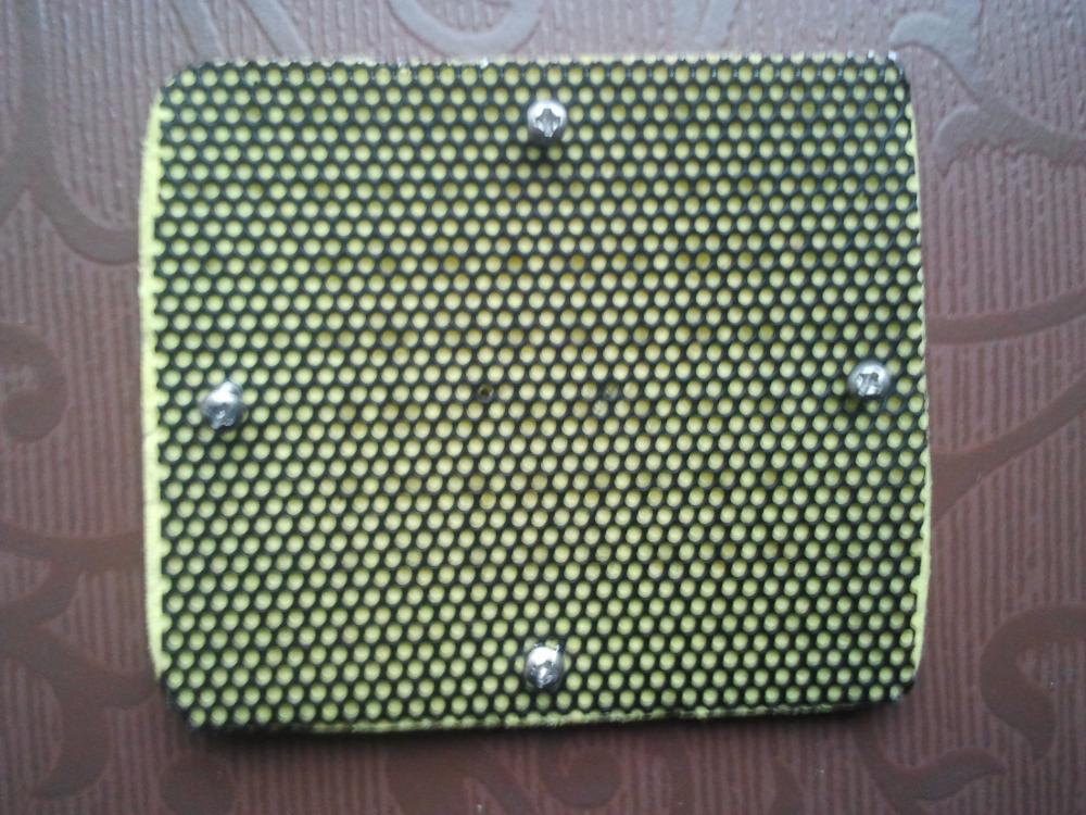 Сзади поставил решетку, вырезанную из автомобильной колонки Ямаха. Дополнительный демпфер сделал из желтой хозяйственной губки.В ней сделаны два отверстия приблизительно по 3 мм напротив центральных щелей магнитов. Демпфирование производилось на слух , после установки амбушюров. Естественно можно сделать любое. Стыки между фм промазаны сп. Третие концы косичек проводов закреплены саморезами. Решетки то же закреплены саморезами.