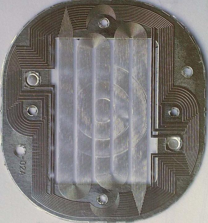 Рисуем на компе спиральные дорожки (только вот чем?). Печатаем струйником (интересно, для струйников есть водостойкие чернила?) прямо на металлизированной стороне плёнки (плёнку, что бы принтер её не зажевал, можно подклеить к листу бумаги) или на бумаге лазерником. Если напечатали лазерным принтером, то переводим рисунок на плёнку ацетоном (тут правда под вопросом качество перевода). Далее травим металлизированный слой соляной кислотой (Ёрш для унитазов) или хлорным железом. Смываем ацетоном печать. Мембрана готова.