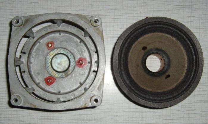 Динамики разобрал (там еще и винта крепления магнитной системы не хватало), немного клея отмыл, подвес переклеил, катушки отцентрировал и таким образом подготовил их к экспериментам.