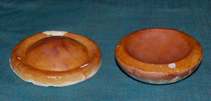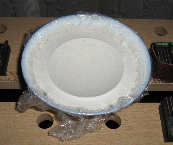 На следующий день, не вынимая форму из пиалы, скальпелем выровнял наружный край по окружности, и сделал его под углом, чтобы край будущего колпака так же был под углом и повторял конус диффузора (видно на фото ниже). После этого покрыл форму несколькими слоями лака. Лак впитался в гипс, укрепил его и образовал гладкое покрытие. После высыхания лака намазал форму аптечным вазелином и залил сверху жидким алебастром. Раствор должен быть достаточно жидким, чтобы затечь во все углубления формы, но не слишком, иначе она будет непрочной. У меня часть формы из алебастра получилась как раз недостаточно прочной. Когда алебастр затвердел и высох, довольно легко разделил половинки формы и нижнюю часть также покрыл лаком (шеллаком)…