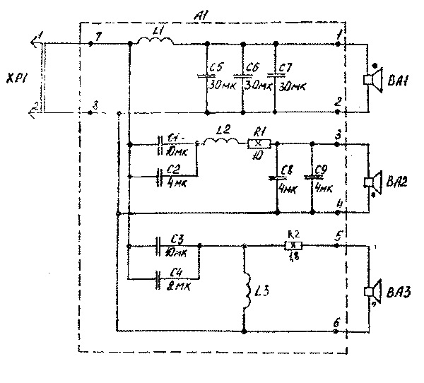 Здесь ВА1 - низкочастотник, ВА2 - среднечастотник, ВА3 - высокочастотник. Встречал вариант схемы (вероятно, более поздний), где в высокочастотном звене не было резистора R2. В дорабатываемых колонках как раз обошлись без этих резисторов. Почему изменили схему, неизвестно. Может это рацпредложение завода-изготовителя, а может «несуны» обменяли ведро резисторов на пару бутылок «Пшеничной» и их просто не хватило на фильтры. До доработки особого дисбаланса в звуке слышно не было, поэтому новые фильтры монтировал без резисторов R2. Но позже к ним еще вернулся.