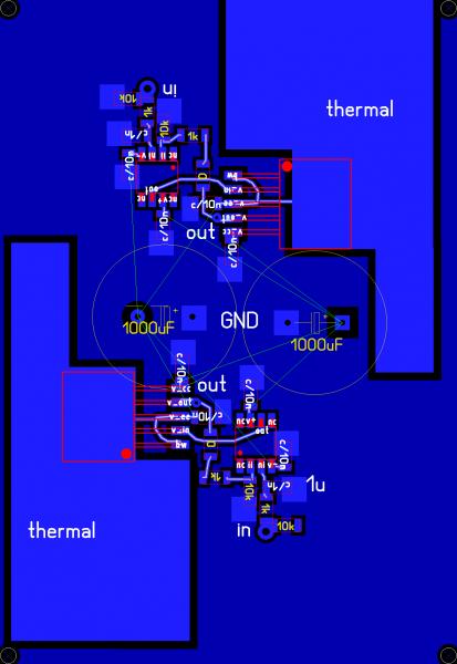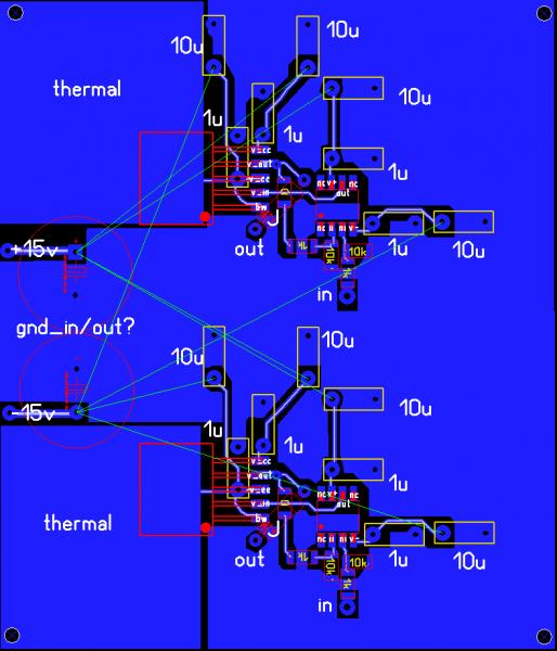 Так и есть: разводку, похоже, делали со схемы на втором листе, а там перепутаны местами номиналы R15/R16 и R19/R20 во втором канале. В таком виде, как она есть сейчас схема работать будет, но как повторитель.