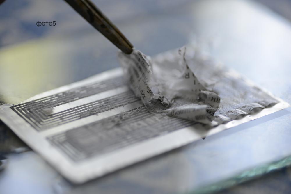 Теперь протираю изопропиловым спиртом дорожки (тонер ИЗОПРОПАНОЛ НЕ РАСТВОРЯЕТ). Если есть небольшие коцки на трафарете, дорисовываю перманентом (хотя цапонлаком надежнее). Теперь КАК ДОБИТЬСЯ РАВНОМЕРНОГО ТРАВЛЕНИЯ ДОРОЖЕК? Легко- просто обвожу по контуру трафарета по фольге тонкой иголкой(фото12). Если Вам надо больше баса — с нажимом (образуется рифление), если плоскую мембрану — без нажима.
