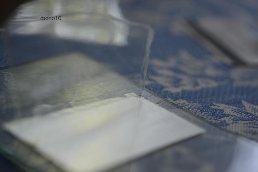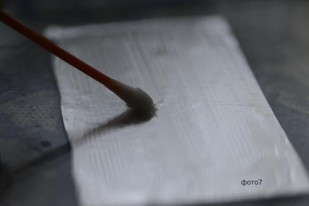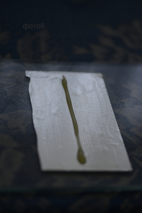 Теперь очищаю предметное стекло, капля воды, сверху фольга, дорожками вниз, зачищаю «клеевую сторону» фольги изопропиловым спиртом ватной палочкой(фото7). Наношу дорожку клея по центру(фото8), сверху лавсан и разглаживаю кредиткой клей под лавсаном(фото9), чтобы не было пузырей(до талого вышаркивать клей не надо). Когда клей равномерно нанесен, разделяю лавсан и фольгу осторожно(фото10), немного дую на нанесенный клей (он полимеризуется), затем снова соединяю лавсан и фольгу, ВСЕ намертво приклеен(фото11).