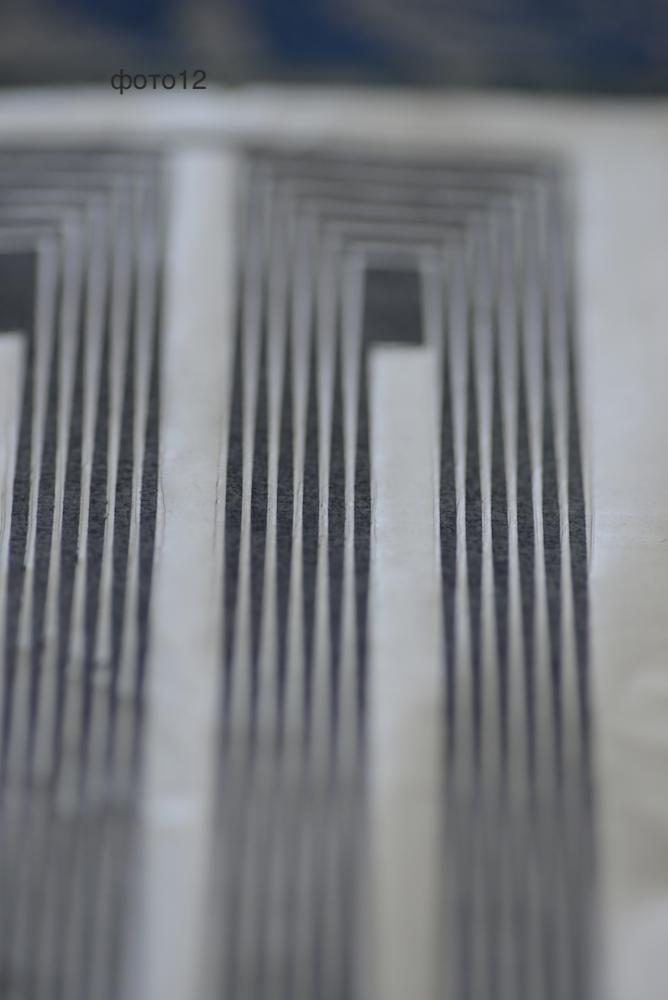Теперь травление(фото13,14): медный купорос 1 часть и поваренная соль 3 части, примерно на глаз, и вода. Травление 2-х мембран провожу в одной и той же концентрации. Травление около минуты, быстрое. Окунув мембрану в раствор, травлю держа мембрану в пинцете, контролируя глазом и сразу под струю воды. Промываю. Теперь сушка(фото15), и снятие тонера ацетоном, ватной палочкой вдоль дорожек(фото16). МЕМбрана готова, замер сопротивления. Наклеиваю на текстолит, смотря чтоб правильно соотносилась с магнитами дорожки (на клей бизон, если криво-легко снять ацетоном). Контакт устанавливаю простым зажиманием провода текстолитом или на клей токопроводящий «контактол». Паять алюминий без прожига лавсана еще не научился. Скручиваю винтами, ГОТОВО.