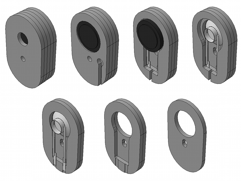 Вот приблизительно так, думаю, должен выглядеть наушник. Материал - акрил 2 мм. У меня есть возможность порезать такие детали лазером. Две верхние детали склеиваются между собой, так же как и три нижние и подвижная система. К двум верхним, образующим, таким образом, крышку, приклеивается магнит. Нижняя и верхняя половинки соединяются при помощи винта и гайки. Между ними должна быть тонкая резиновая или силиконовая прокладка в форме поверхности контакта. Центровка магнита относительно зк осуществляется смещением крышки вверх-вниз по оси отверстия под винт в нижней половинке (специально выполненном не круглым, а удлиненным в этом направлении), а так же поворотом влево-вправо относительно оси винта. После нахождения нужного положения винт затягивается.