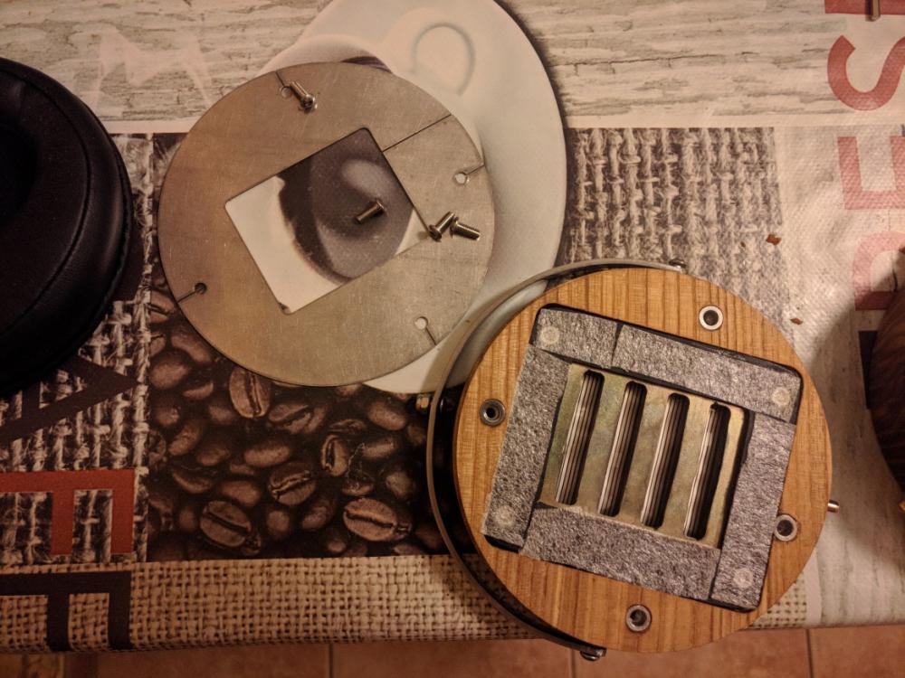 У меня 105 мм чаши (ясень), толщиной 19 мм. Оголовье от ТДС-1. Вес получается уж больно большой, даже больше 600г! Наверно придется часть деталей из нержавейки менять на алюминий (крышки прижимающие драйвера). Еще делать более тонкими дужки на которых крепятся чаши к оголовью.