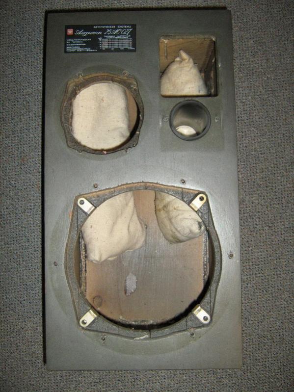 Внутри корпусов находились валики из ватина, набитые ватой, по два в каждой колонке. Приклеены они были так, что труба фазоинвертора как раз упиралась в один из них. Нарочно это было сделано или «так получилось», пока не выяснил. Встречал информацию, что позади трубы фазоинвертора не должно быть никаких преград на расстоянии нескольких сантиметров. При этом владелец винтажных трехполосных Revox говорит, что у них фазоинвертор практически упирается в демпфирующий материал.