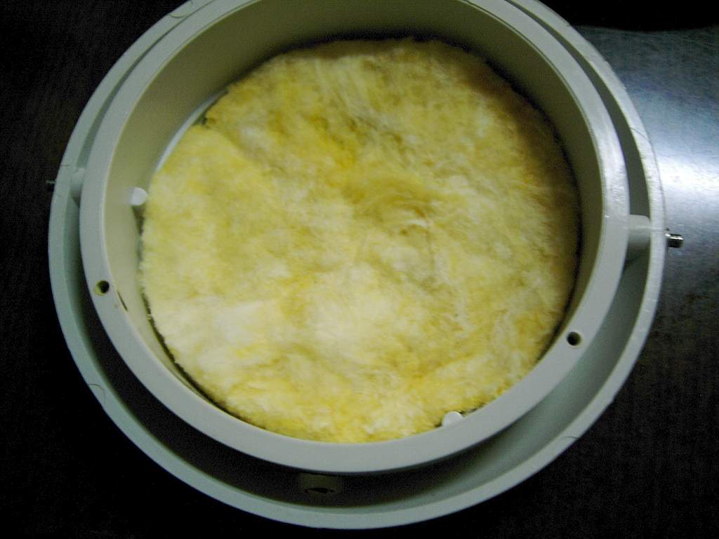 В чашке остается волокнистый демпфирующий материал странно-желтого цвета (не исключено, что когда то он был белым) толщиной около 5 мм. Материал с очень тонким волокном (тоньше ваты) и довольно рыхлый.