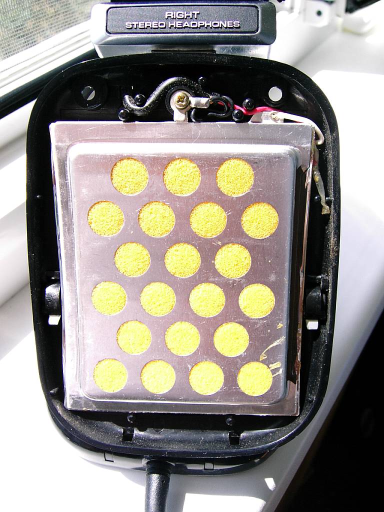 Излучатели заключены в алюминиевый корпус. Собрано всё на клей. В корпусе в виде демпфирующего материала установлен поролон. Когда я это увидел, то в голове мелькнула мысль о том, что изъять его для замены и установить новый будет не просто. Но, как это ни странно, поролон ни сколько не деградировал со временем и выполняет свои функции отлично. Излучатель от уха отделяет очень тонкая металлическая сетка.