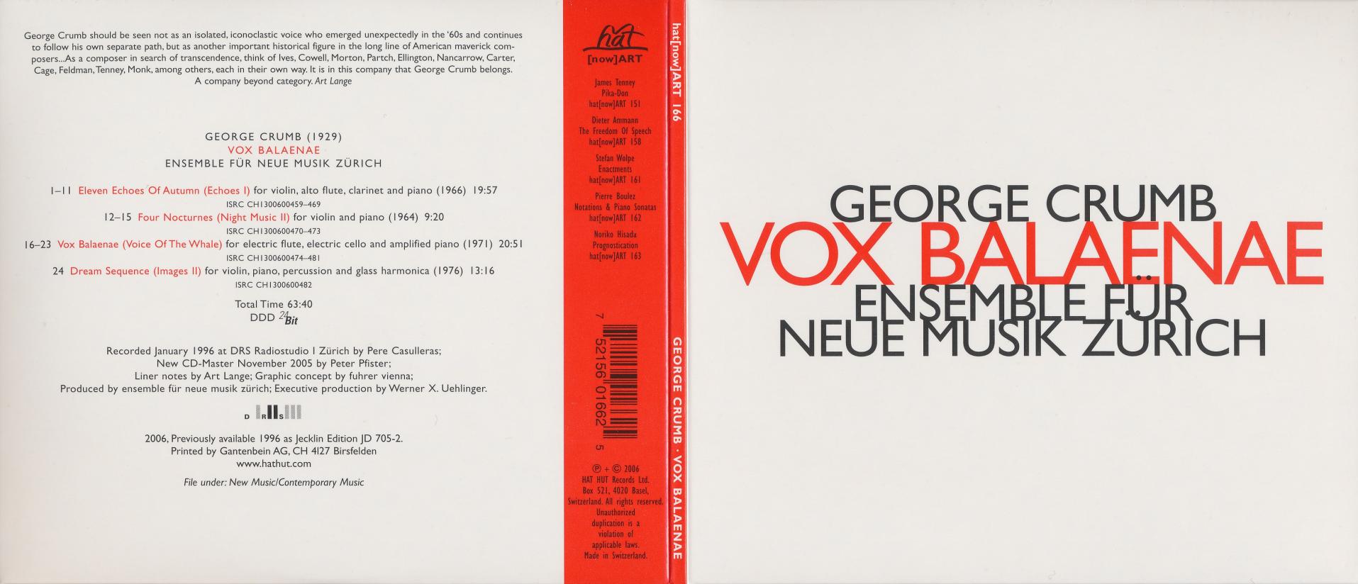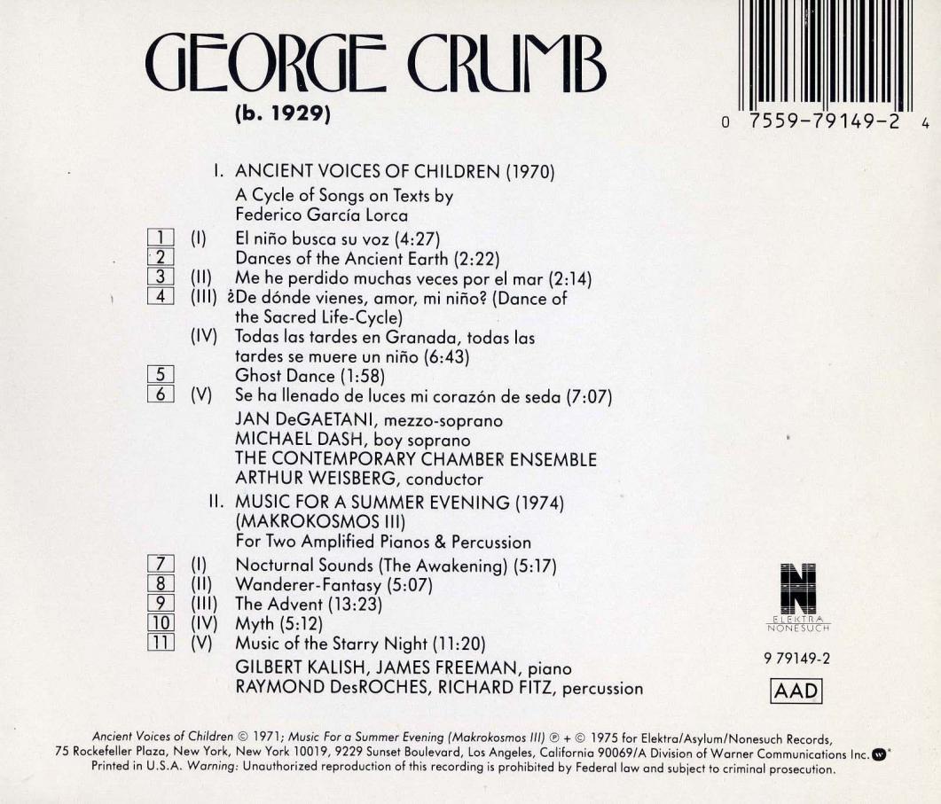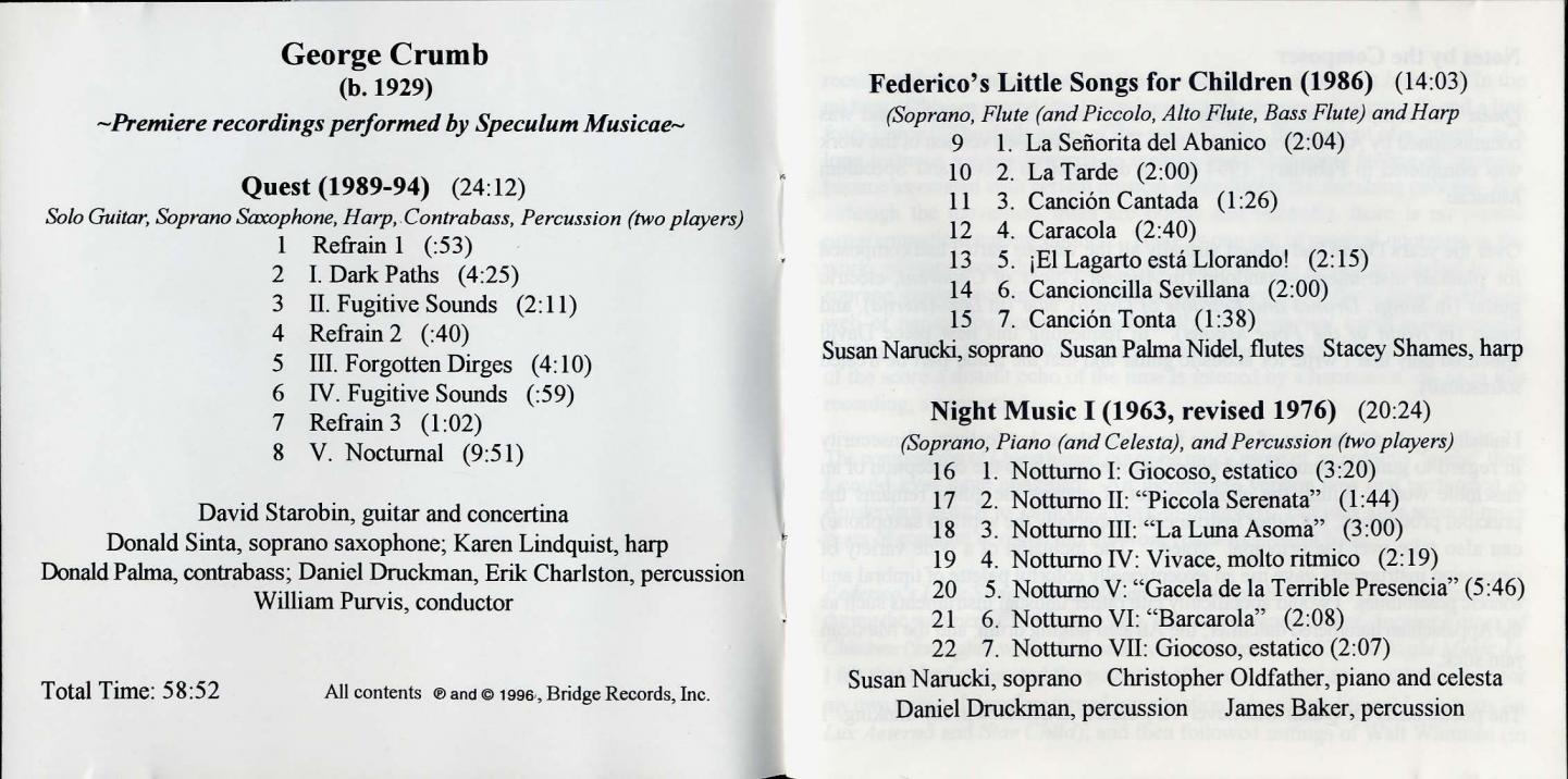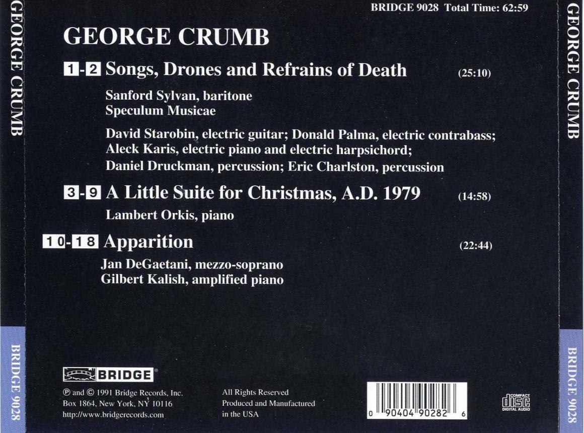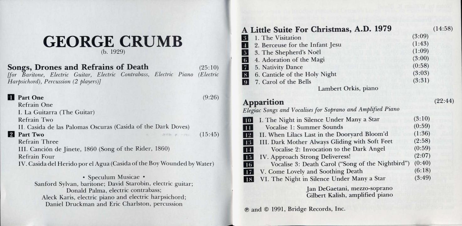 Музыка George Crumb публикуется C.F. Peters, и продолжающаяся серия записей "Complete Crumb", под руководством самого композитора издается на Bridge Records.