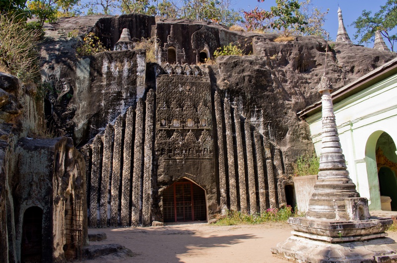 Фасад храма в Пхо Вин Таунг (Мьянма) имитирует деревянную резьбу.